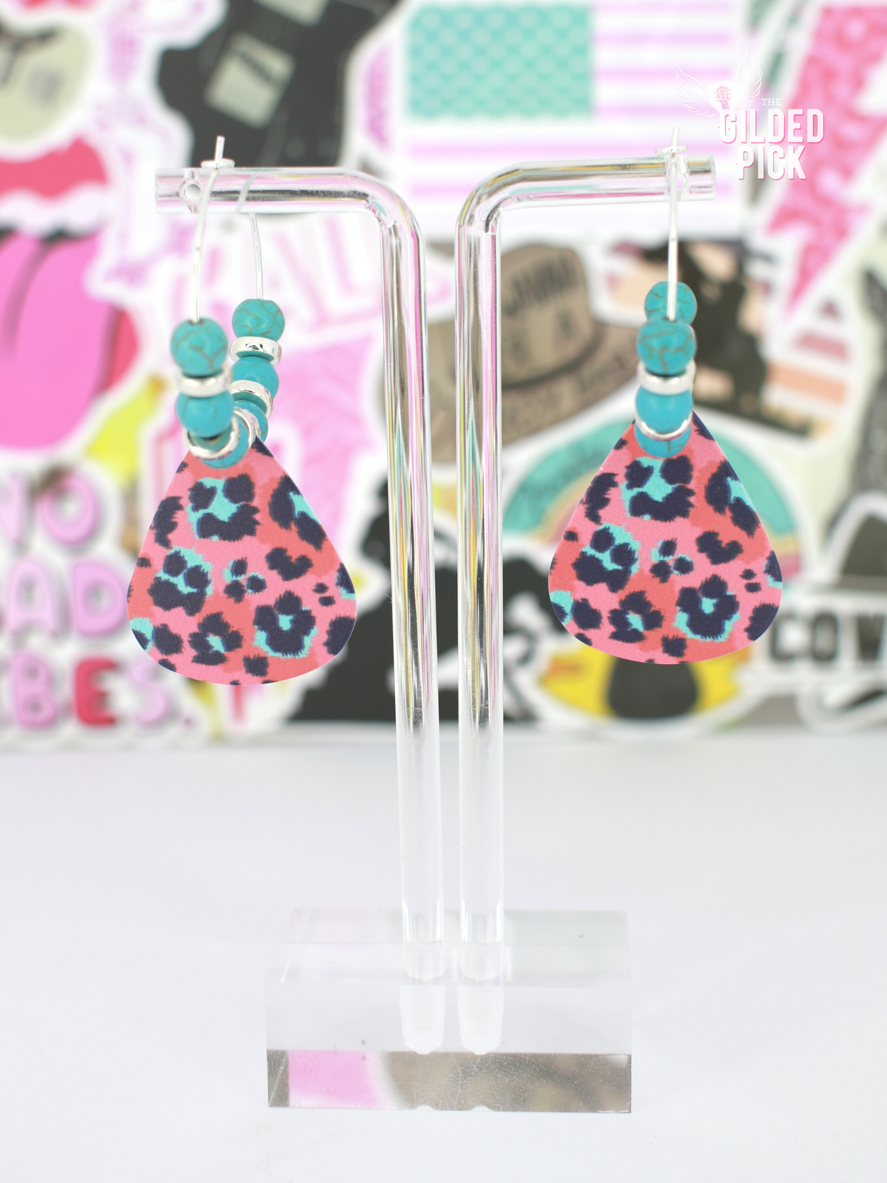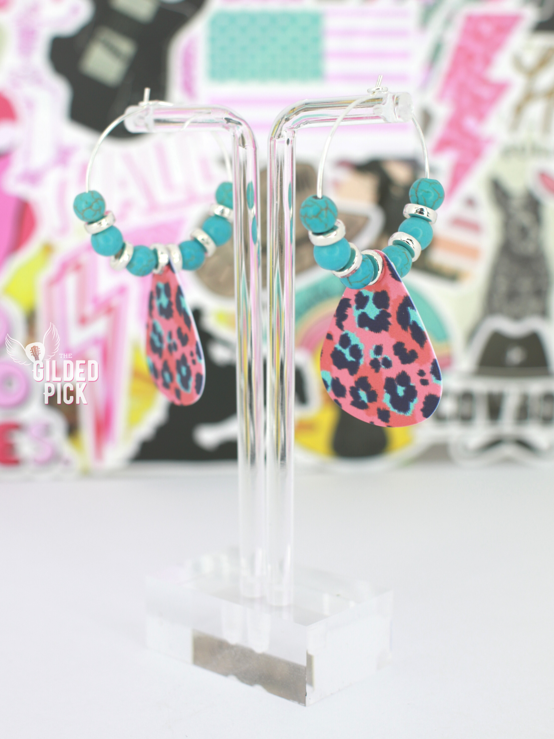 featuring coral leopard guitar picks with turquoise stones on a silver hoop.