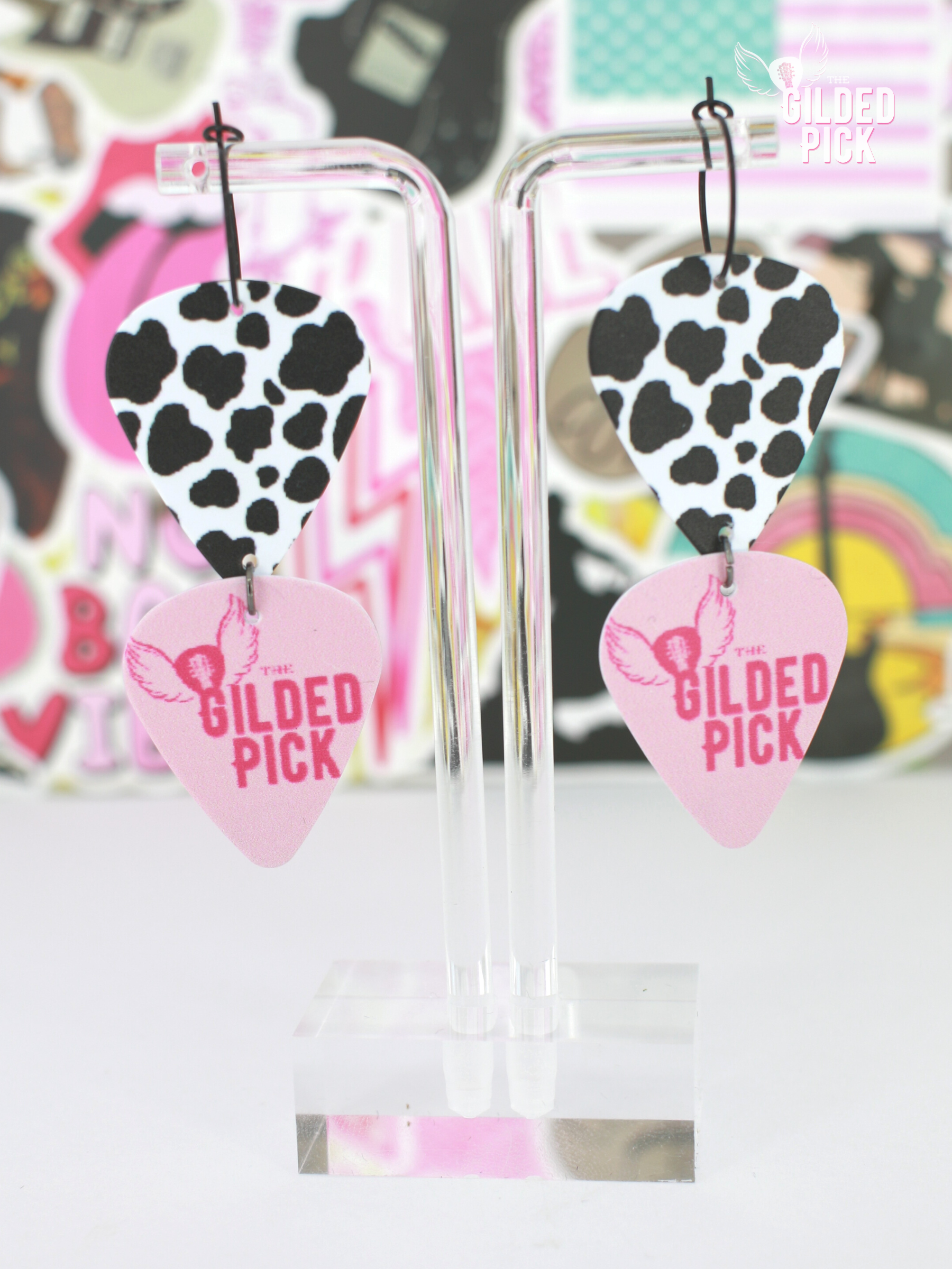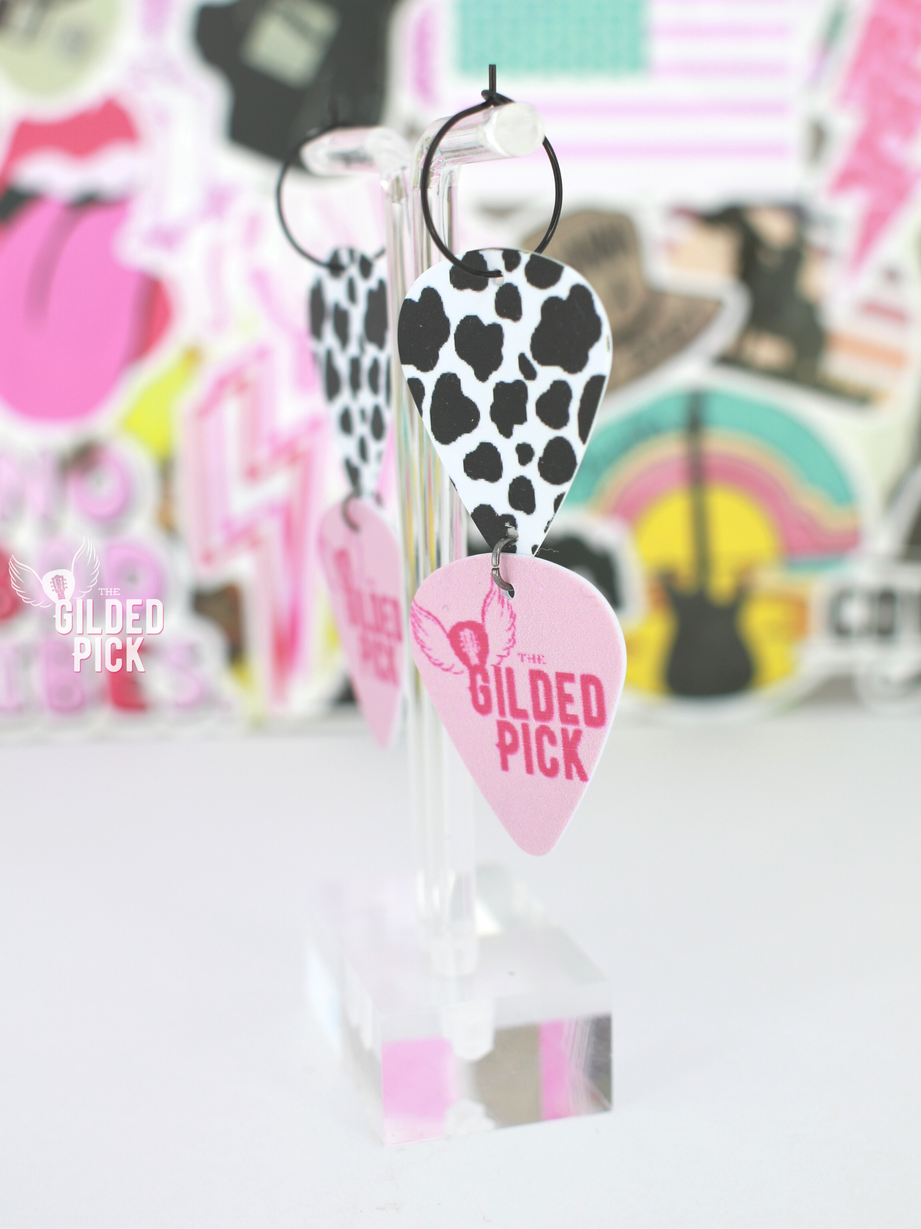 featuring Gilded Pick original picks and cow-print picks on black hoops.