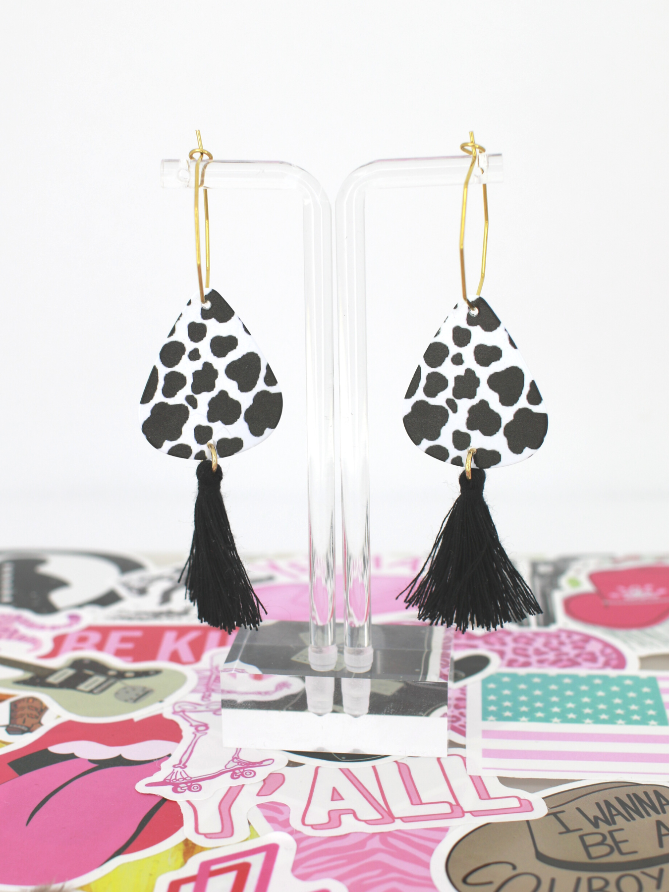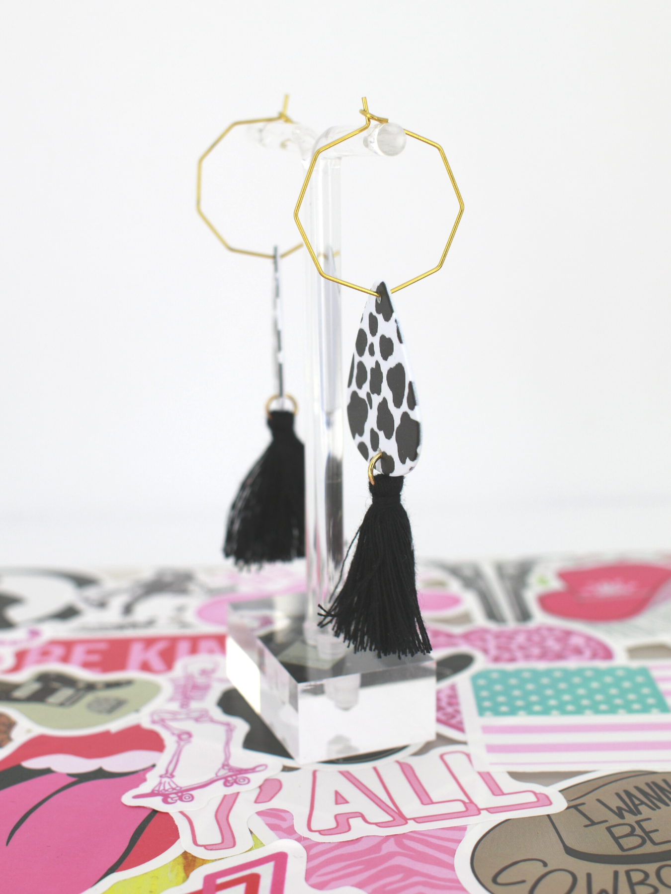 featuring cow-print guitar picks on a gold octagon hoop with black tassels.