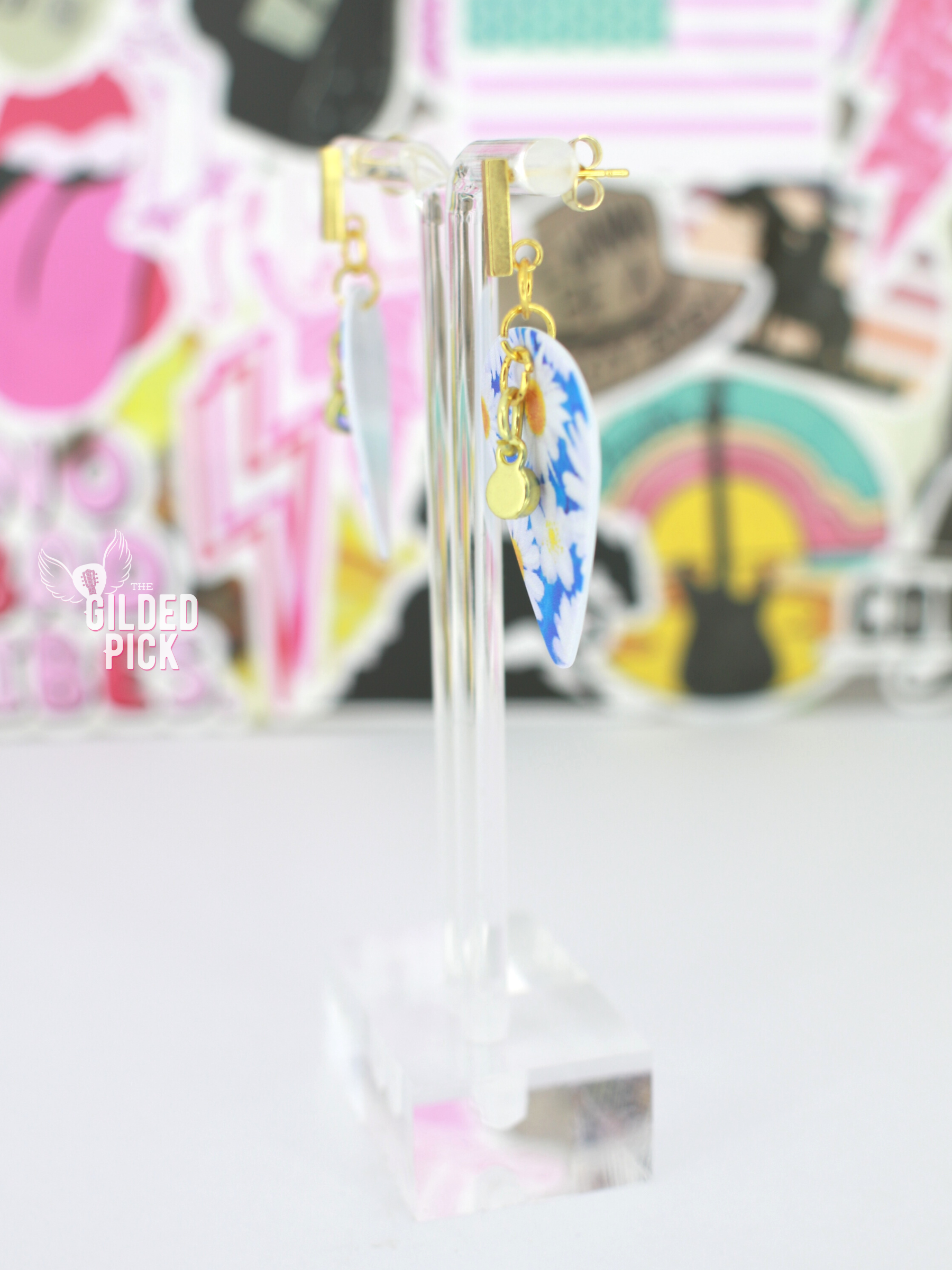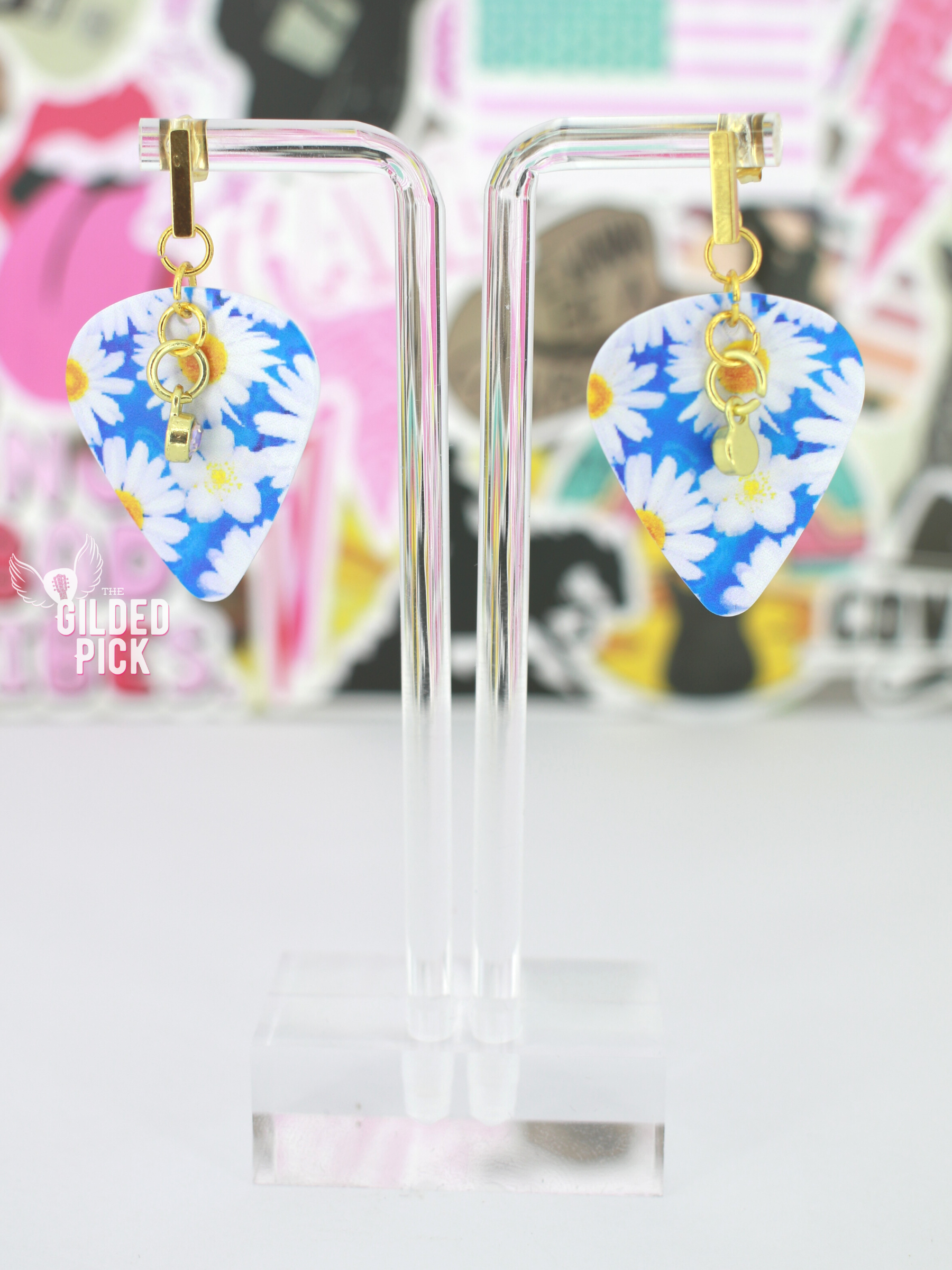 featuring a guitar pick with daisy on a bright blue background and a small, rhinestone embelishment on gold studs.