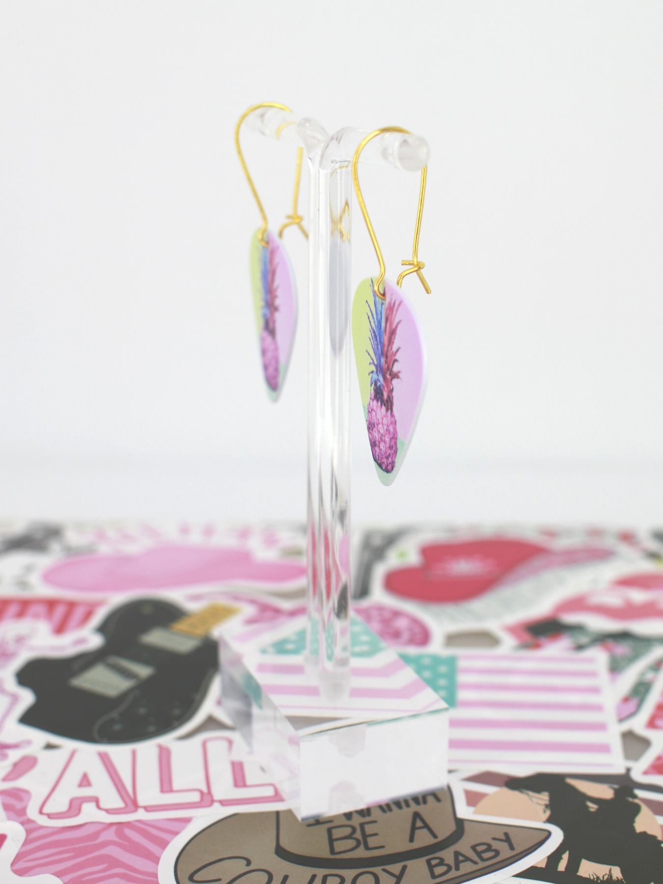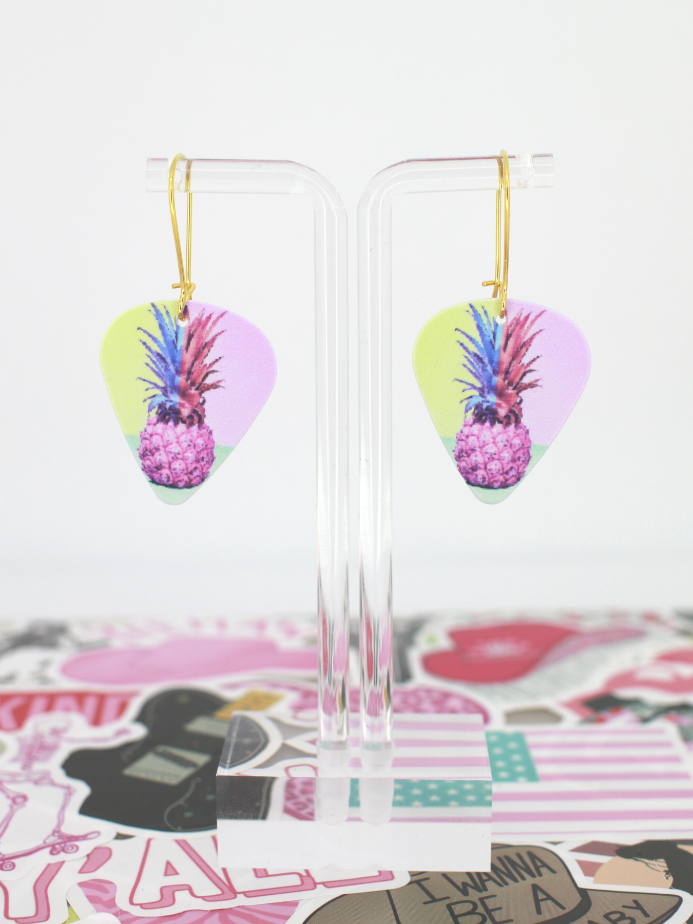featuring pinapple guitar picks on a gold fish-hook hoop.