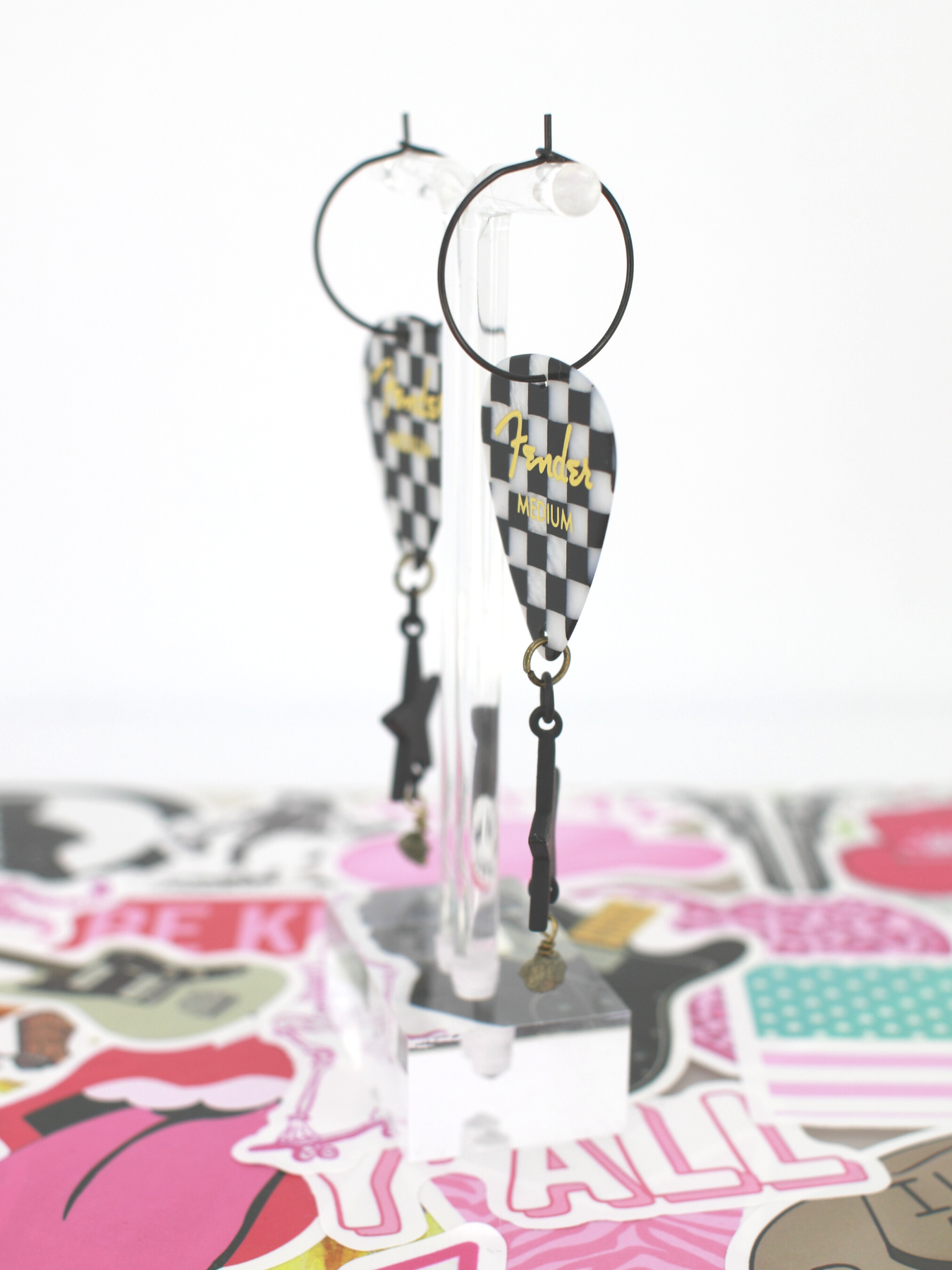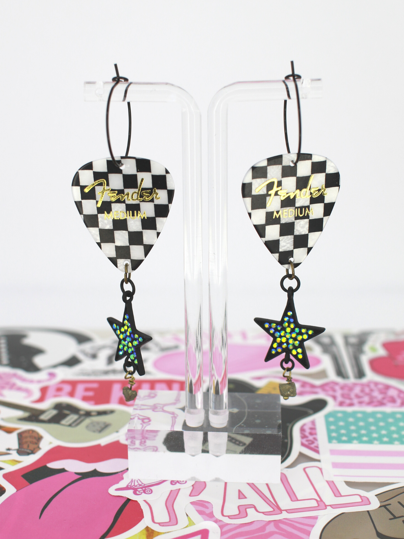 featuring a black and white Fender guitar pick on black hoops and embellished with an iridescent star.