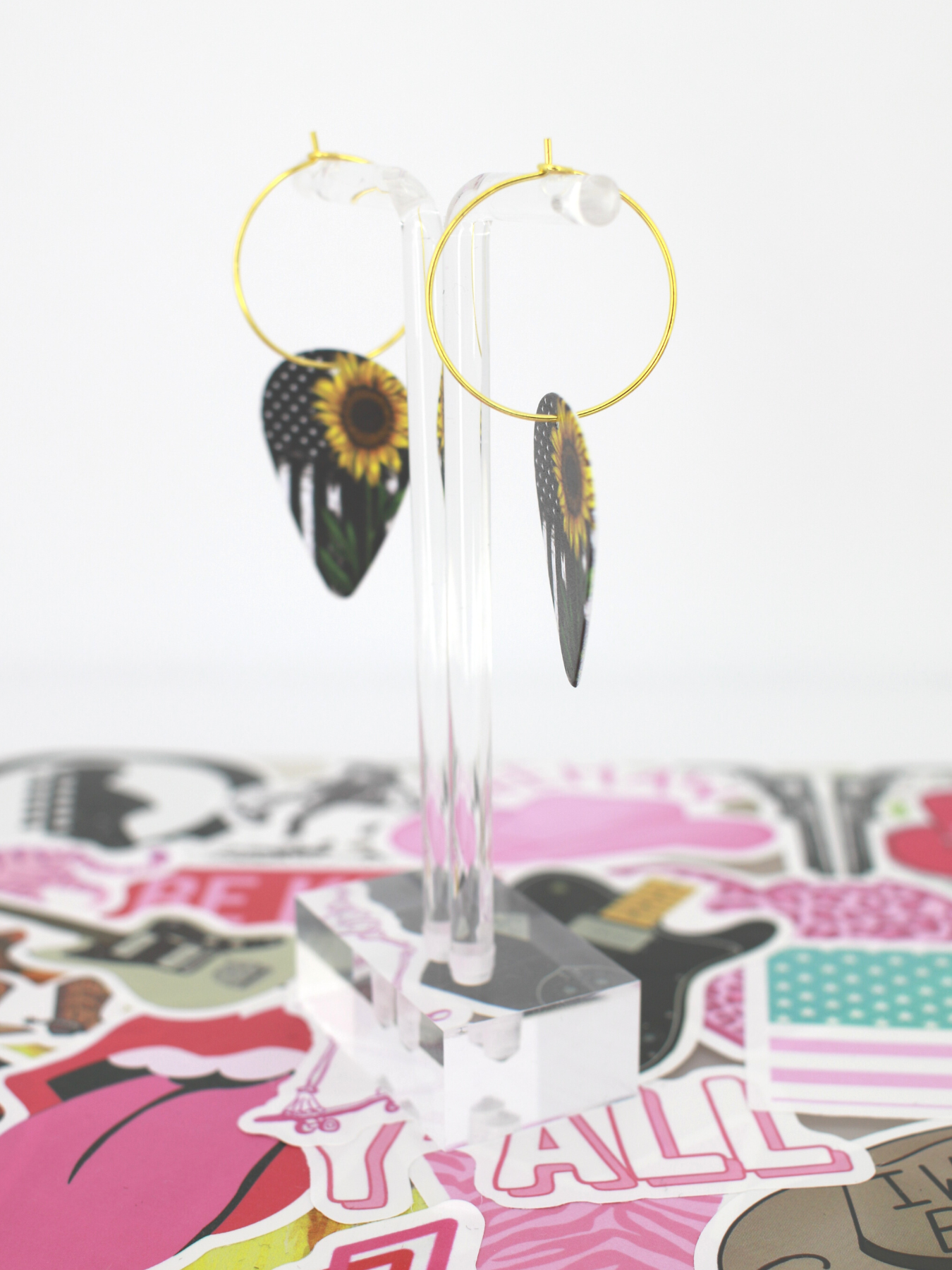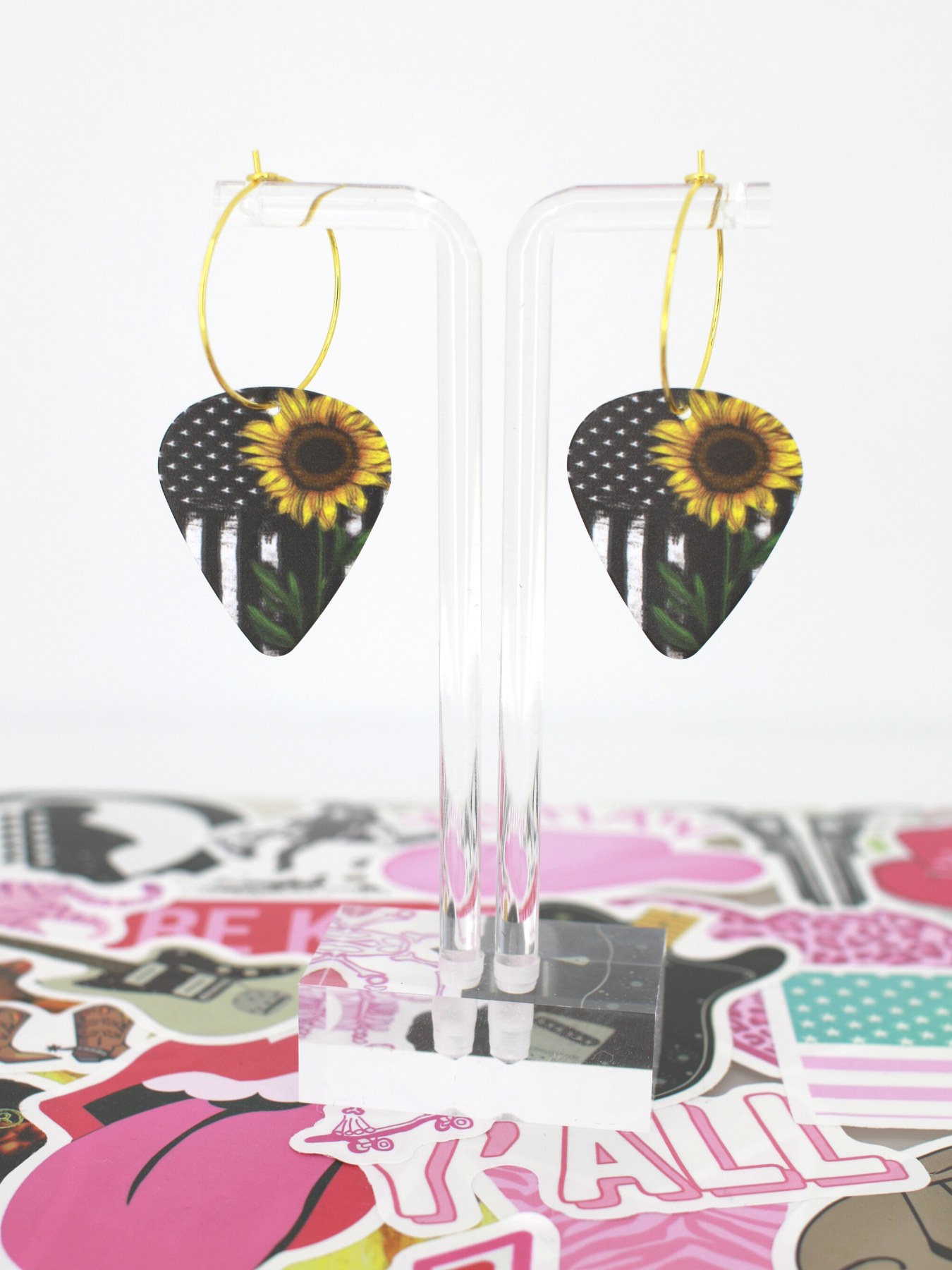 Featuring a sunflower, American flag guitar pick on a gold hoop.